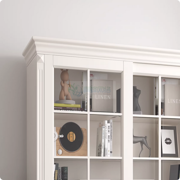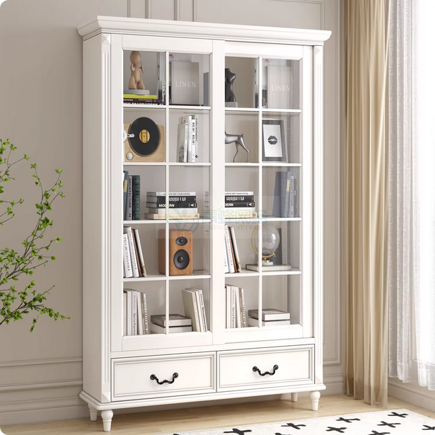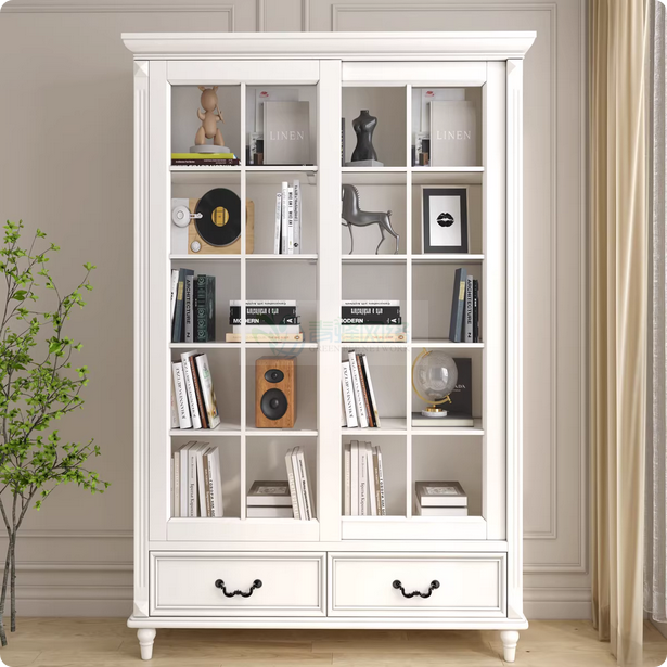 美式书柜全实木带门推拉两门置物柜欧式书橱组合带玻璃门白色木柜